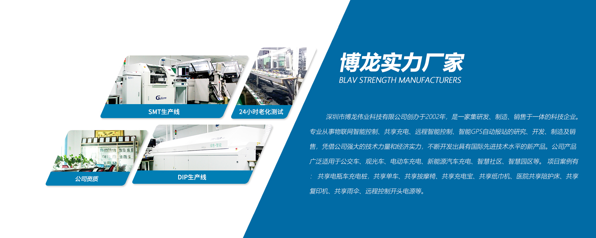 深圳市博龍偉業(yè)科技有限公司創(chuàng)辦于2002年,是一家集研發(fā)、制造、銷售于一體的科技企業(yè)。專業(yè)從事物聯(lián)網(wǎng)智能控制、共享充電、遠(yuǎn)程智能控制、智能GPS自動報站的研究、開發(fā)、制造及銷售,憑借公司強(qiáng)大的技術(shù)力量和經(jīng)濟(jì)實(shí)力,不斷開發(fā)出具有國際先進(jìn)技術(shù)水平的新產(chǎn)品。公司產(chǎn)品廣泛適用于公交車、觀光車、電動車充電、新能源汽車充電、智慧社區(qū)、智慧園區(qū)等。 項目案例有: 共享電瓶車充電樁,共享單車、共享按摩椅、共享充電寶、共享紙巾機(jī)、醫(yī)院共享陪護(hù)床、共享復(fù)印 機(jī)、共享雨傘、遠(yuǎn)程控制開頭電源等。